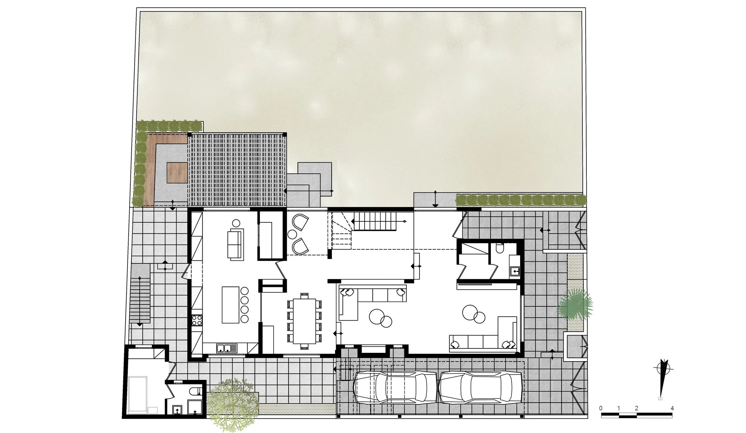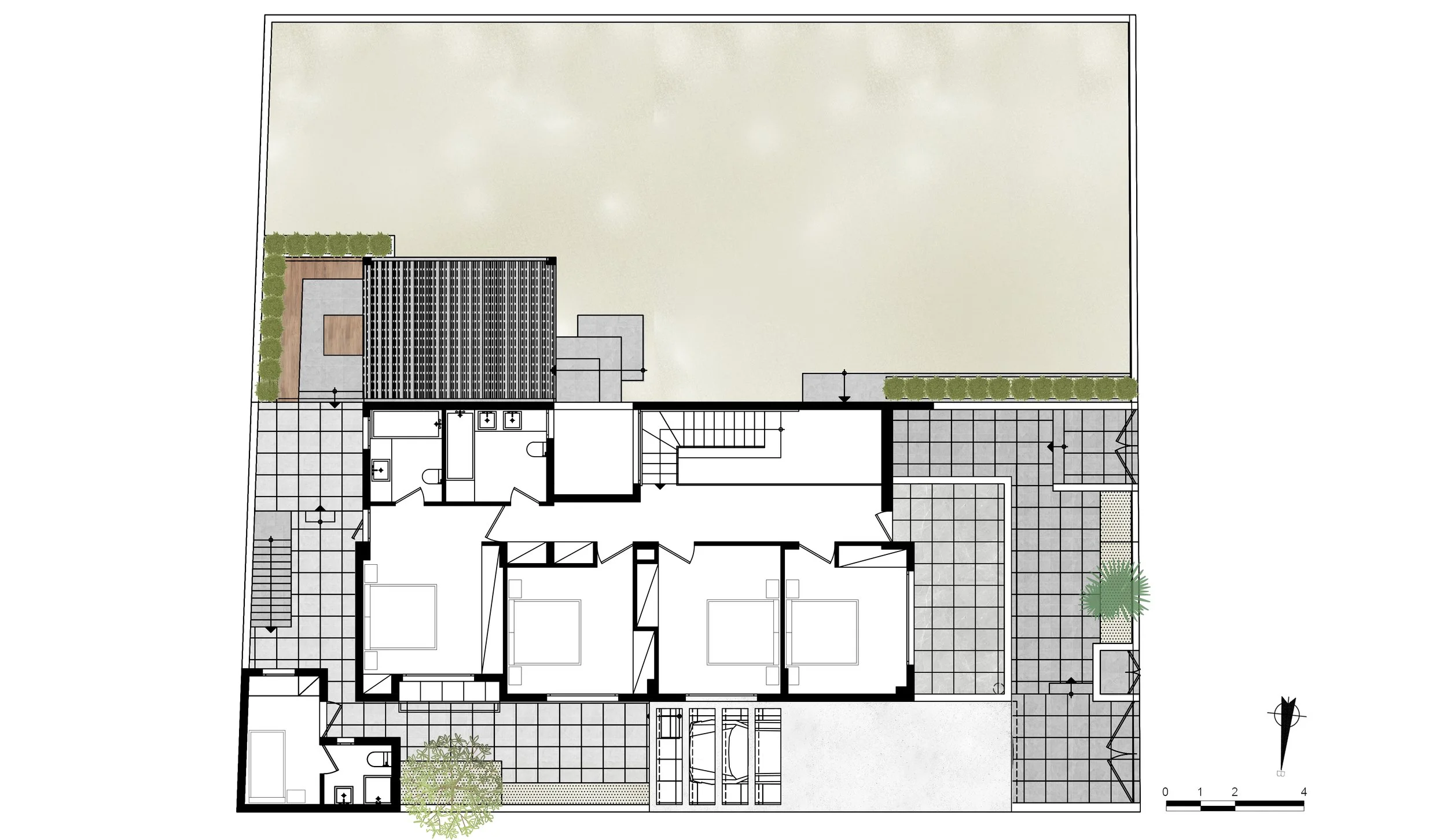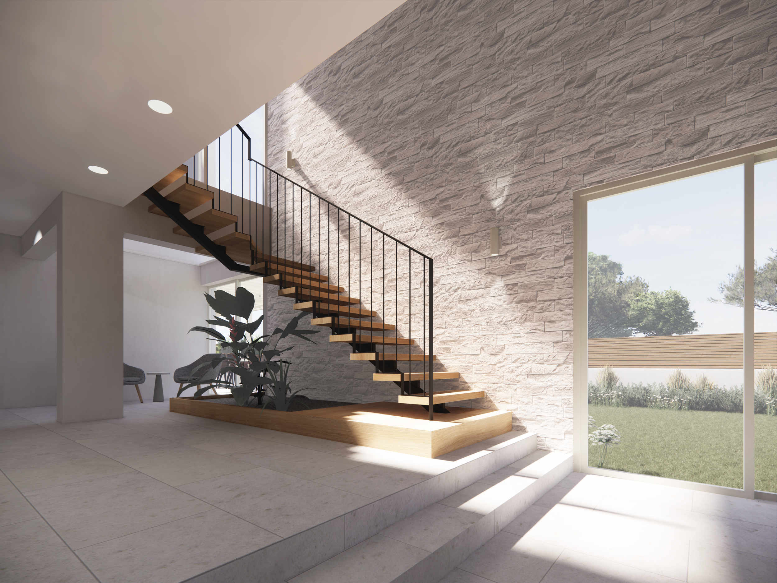 Η σχεδιαστική μας προσέγγιση εστίασε στην ανάδειξη των εσωτερικών σχέσεων μεταξύ χώρων και υλικών, δεδομένου ότι δεν υπήρχαν αξιοσημείωτες οπτικές φυγές προς την αυλή. Επιλέχθηκαν γήινες αποχρώσεις στους τοίχους και τα έπιπλα, οι οποίες συμπληρώνουν τις ανοιχτόχρωμες αποχρώσεις του υπάρχοντος δαπέδου, δημιουργώντας μια ατμόσφαιρα χαλάρωσης και ηρεμίας.