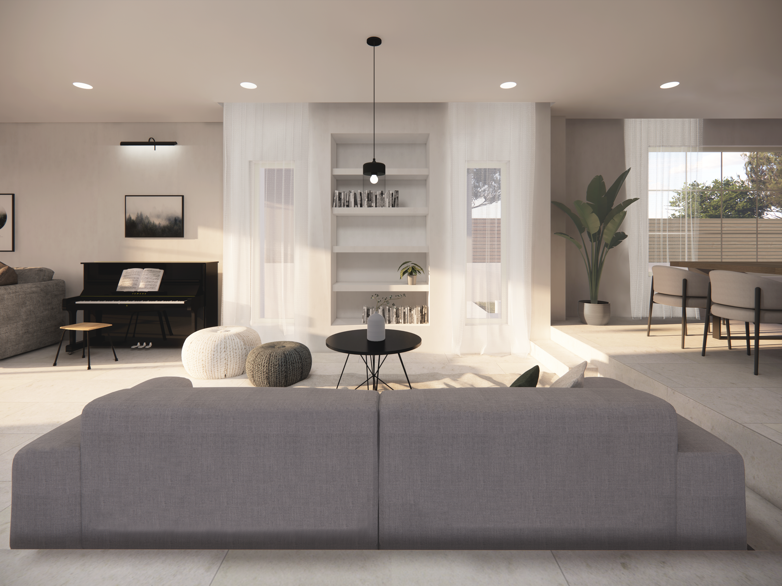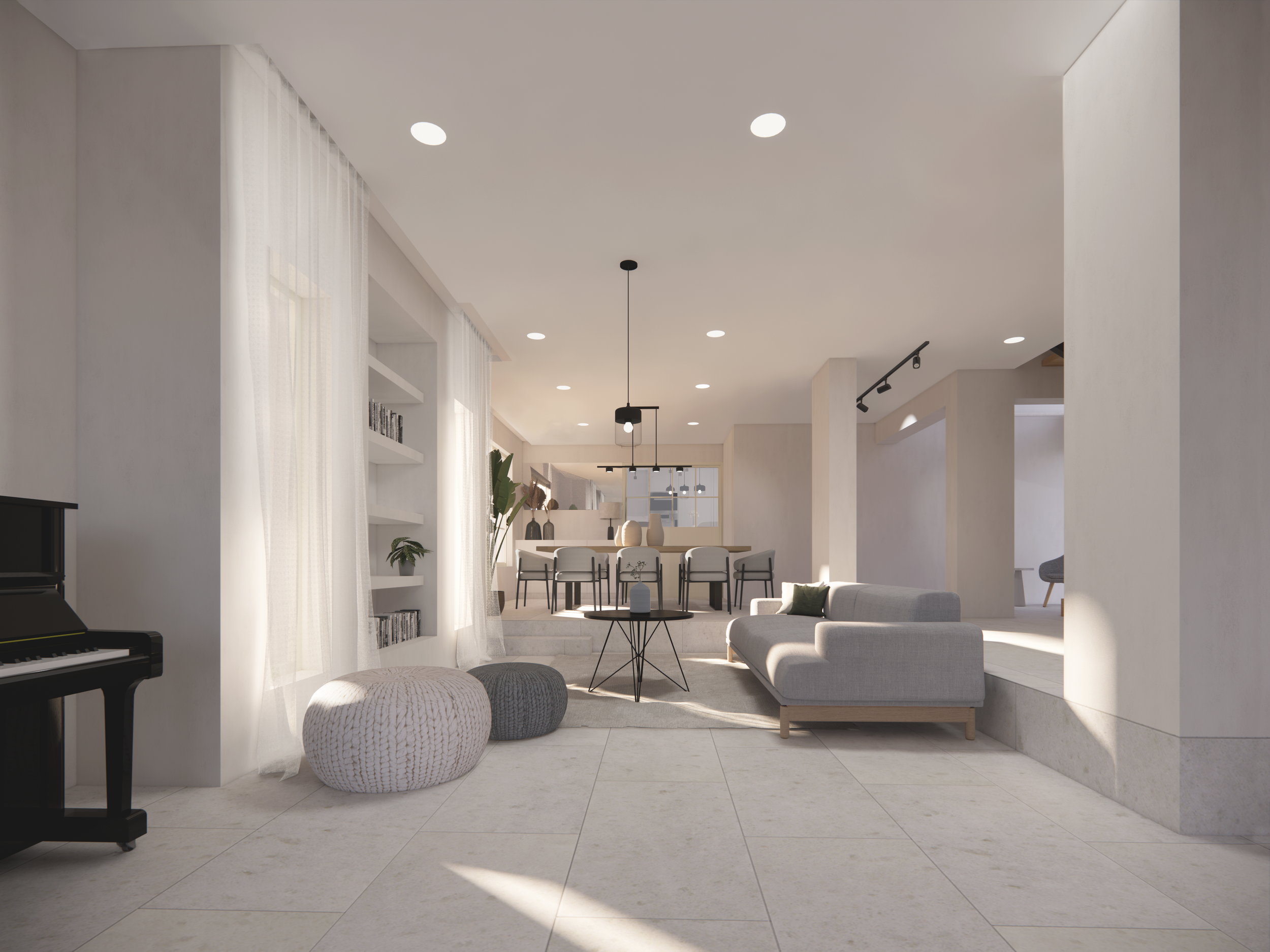 Η διάταξη των εσωτερικών χώρων αξιολογήθηκε θετικά από τους σημερινούς ιδιοκτήτες, και με μικρές, διακριτικές παρεμβάσεις στα υλικά και τα ανοίγματα, προέκυψε μια ανανεωμένη κάτοψη. Οι χώροι διημέρευσης διατηρήθηκαν αναλλοίωτοι, ενώ οργανώθηκαν εκ νέου σε έναν ενιαίο, οπτικά και λειτουργικά εναρμονισμένο χώρο. Στον όροφο, τα υπνοδωμάτια και οι υγροί χώροι παρέμειναν ως είχαν, χωρίς να γίνουν δομικές αλλαγές.